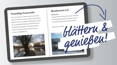 Die aktuelle Ausgabe Ihres Mitteilungsblattes Woche für Woche zuverlässig und bequem in Ihrem Briefkasten – und wenn Sie unterwegs sind, den Gemeindeanzeiger flexibel und mobil auf dem Smartphone oder Tablet lesen. Unser Kombi-Angebot macht‘s möglich!